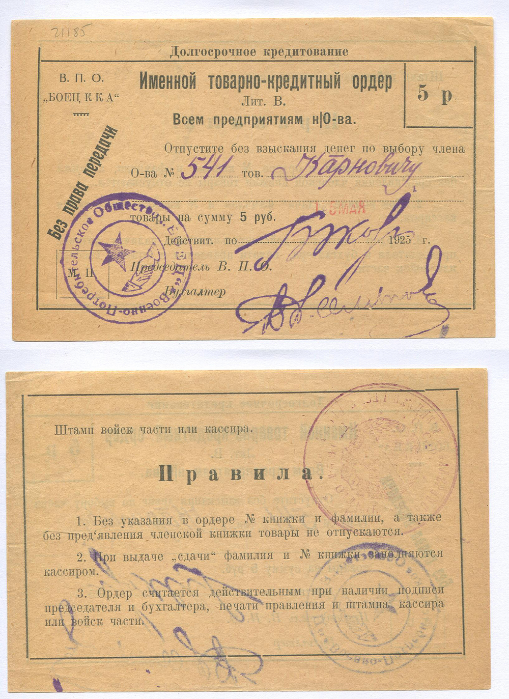 Тифлис. В. П. О. "Боец Р. К. А.". Именной товарно-кредитный ордер. 5 руб. Рябч.2 № 21185 Лит. В