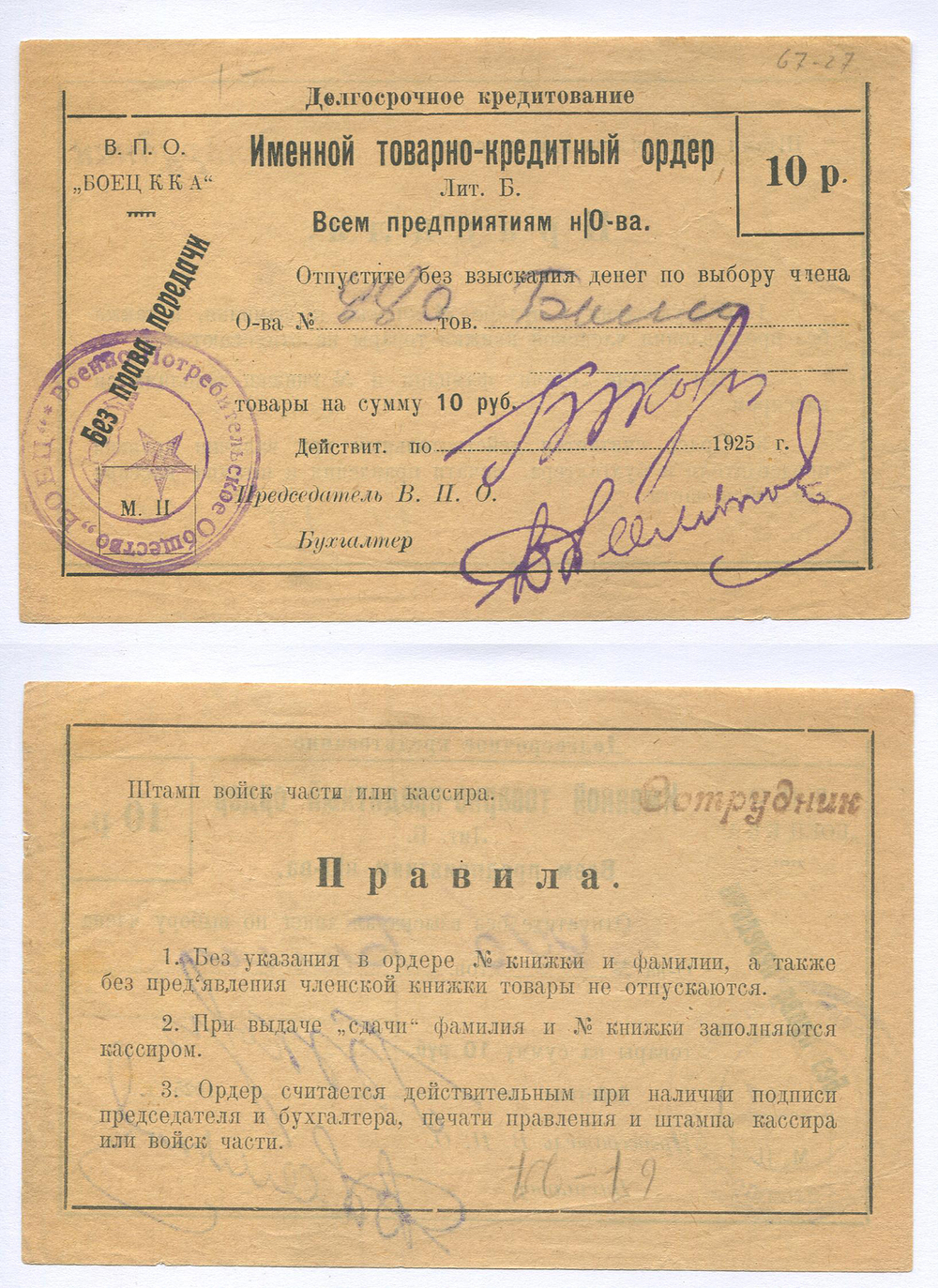 Тифлис. В. П. О. "Боец Р. К. А.". Именной товарно-кредитный ордер. 10 руб. Рябч.2 № 21186 Лит. Б