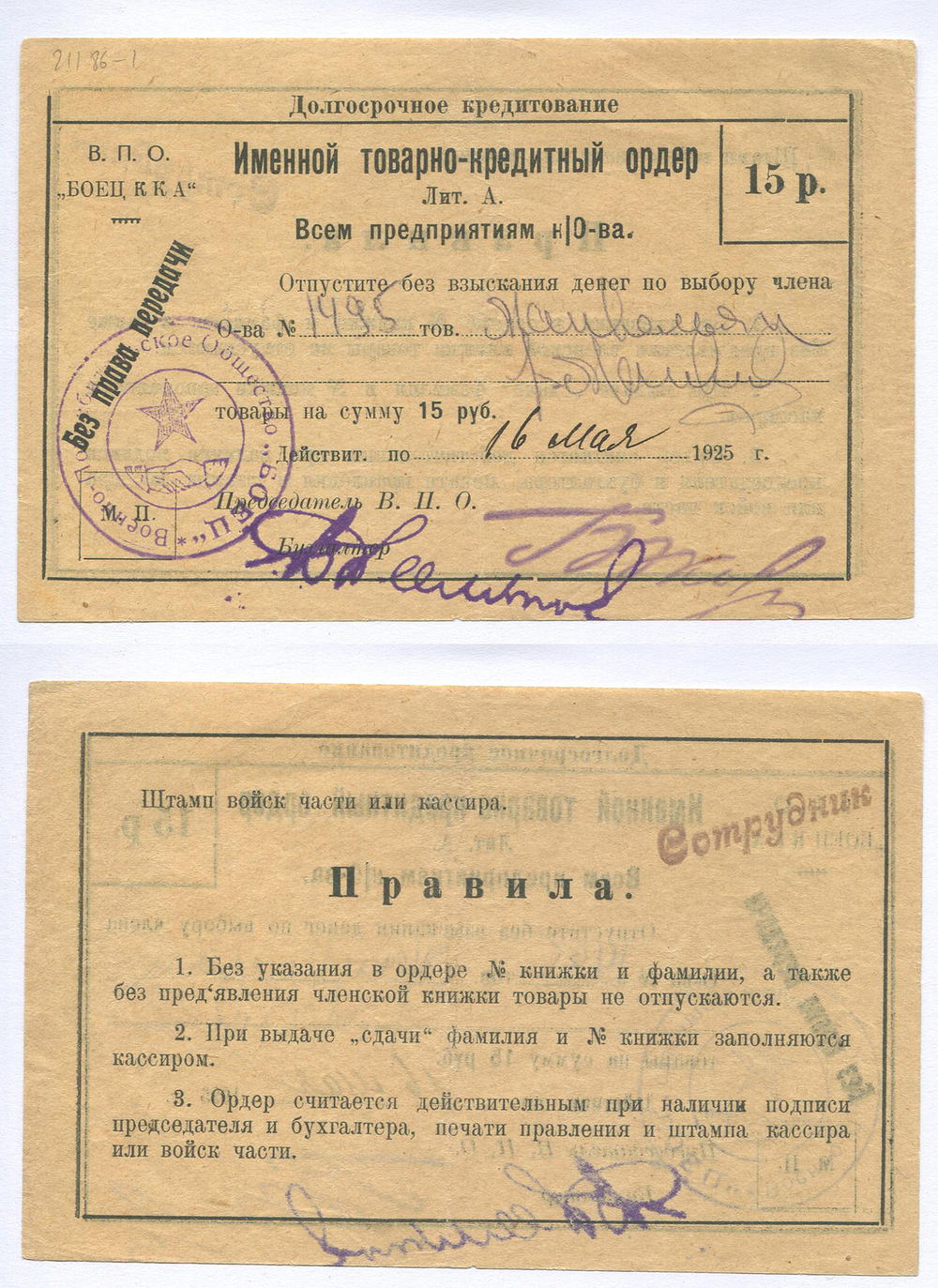 Тифлис. В. П. О. "Боец Р. К. А.". Именной товарно-кредитный ордер. 15 руб. Рябч.2 № 21187 Лит.А