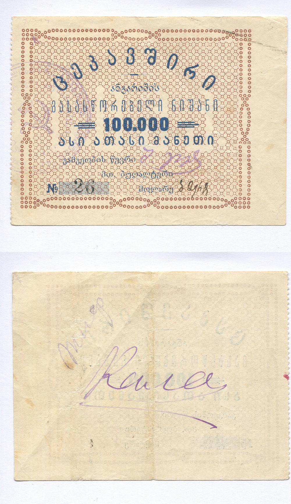 Тифлис. Грузинский союз потребительских обществ "Цекавшири". 100.000 руб. Рябч.2 № 21077 # 26