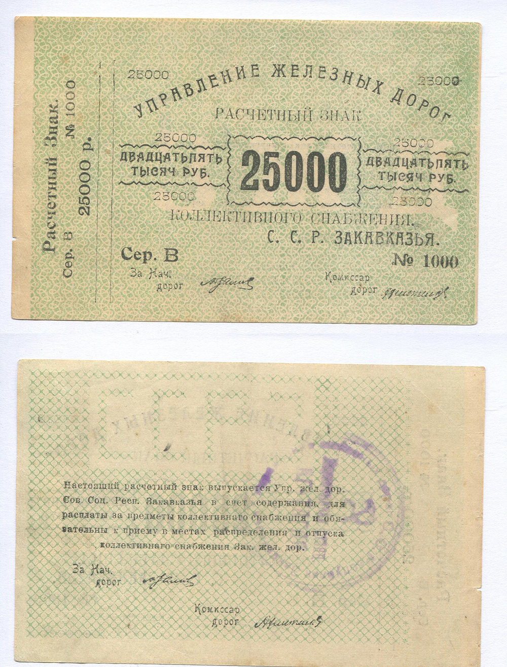 Управление ж/дорог Закавказья. Расчётный знак. 25.000 руб. Рябч.2 № 20962 # В 1000 б/г