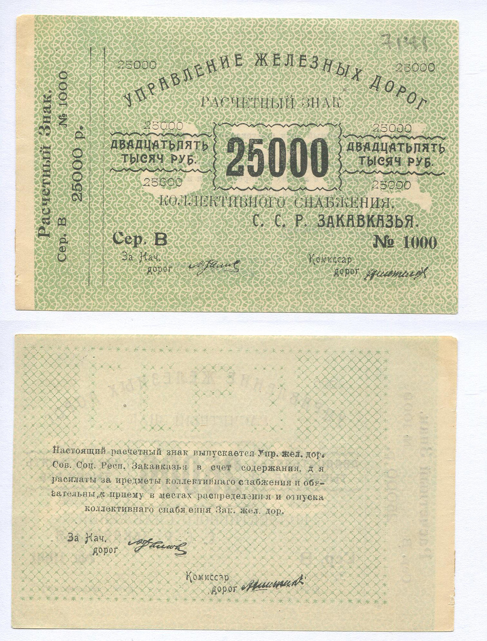 Управление ж/дорог Закавказья. Расчётный знак. 25.000 руб. Рябч.2 № 20962 # В 1000 б/г