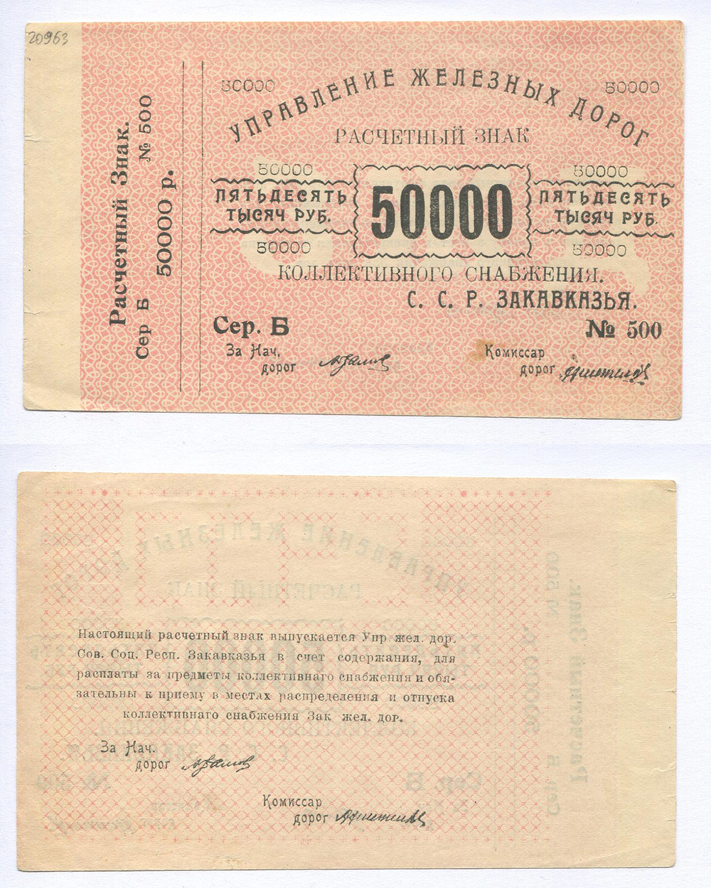 Управление ж/дорог Закавказья. Расчётный знак. 50 000 руб. Рябч.2 № 20963 # Б 500 б/г