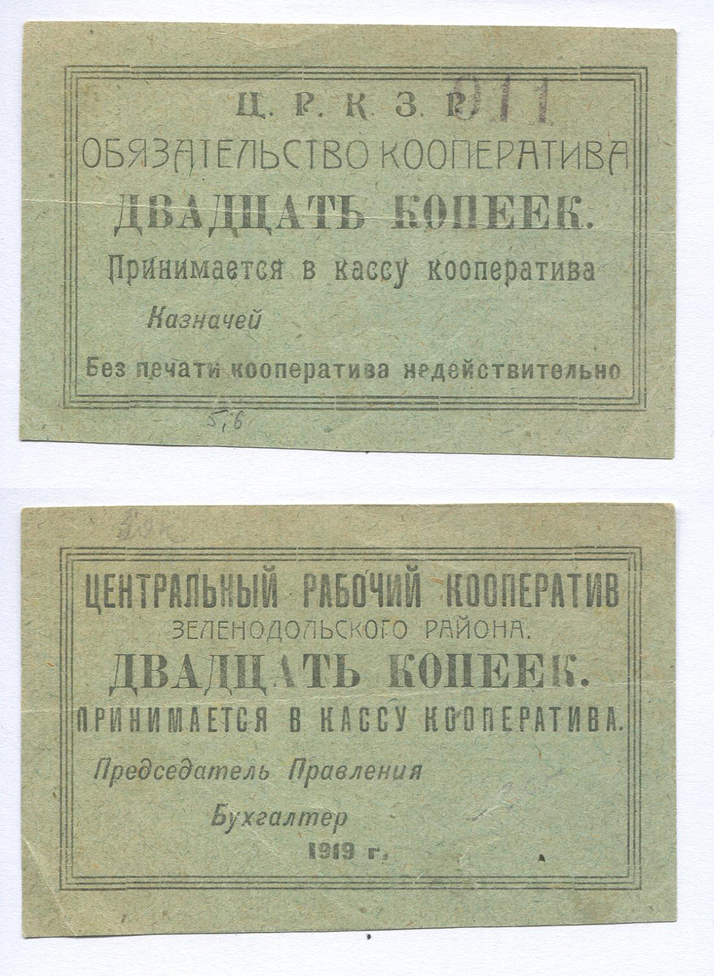 Зелёнодольск (Казанской губ.) Центральный рабочий кооператив. 20 коп. Рябч. 2 № 4668 1919 г. # 011
