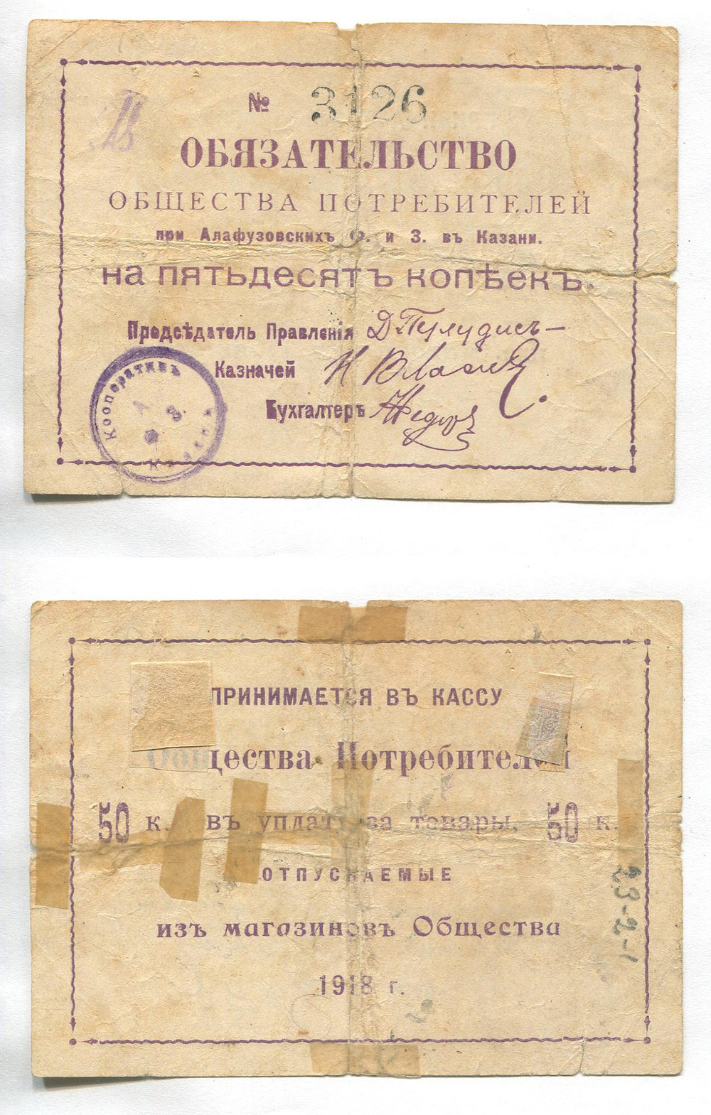 Казань. Потребит. Общество при Алафузовских фабриках и заводах. 50 коп. Рябч.2 № 4676 # 3126