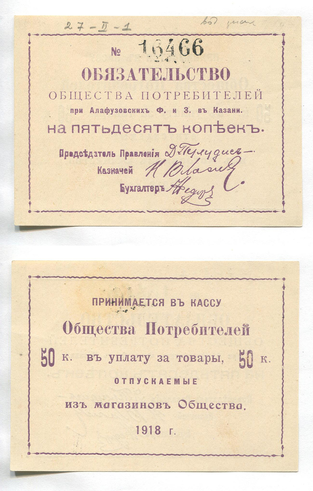 Казань. Потребит. Общество при Алафузовских фабриках и заводах. 50 коп. Рябч.2 № 4676 # 16466