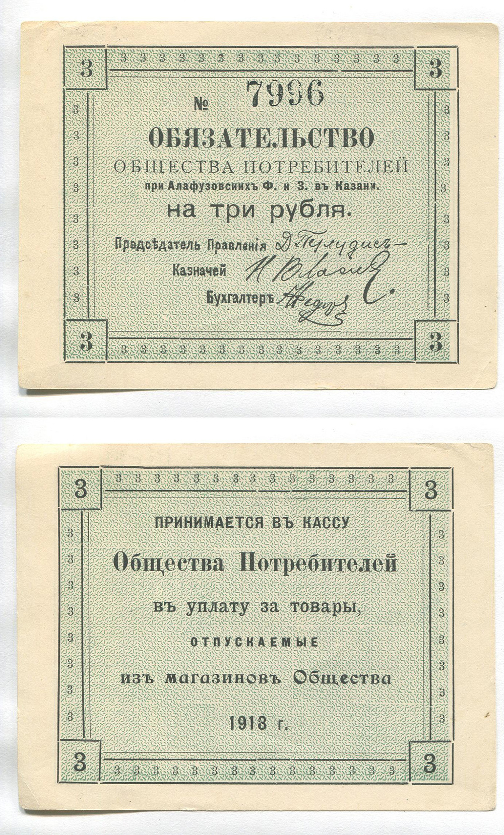 Казань. Потребит. Общество при Алафузовских фабриках и заводах. 3 руб. Рябч.2 № 4678 # 7996
