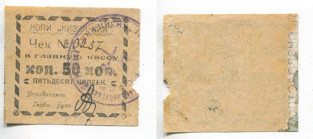 Кизил-Кия (Копи). Чек в Главную Кассу. 50 коп. Рябч.2 № 22210 # 3287