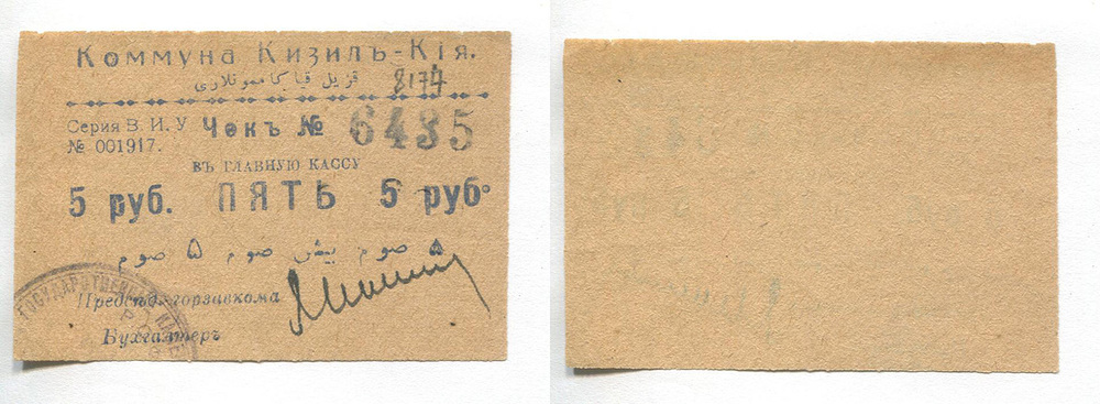 Кизил-Кия (Коммуна). Чек в Главную Кассу. 5 руб. Рябч.2 № 22213 # 6435 без зубцов