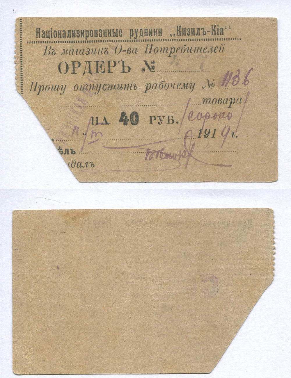 Кизил-Кия. Национализированные Рудники. Ордер. 40 руб. Рябч.2 № 22243 # 1136