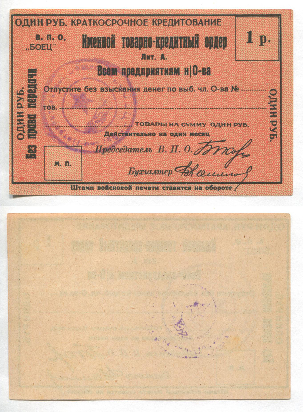 Тифлис. В. П. О. "Боец Р. К. А.". Именной товарно-кредитный ордер. 1 руб. Рябч.2 № 21182 Лит. А