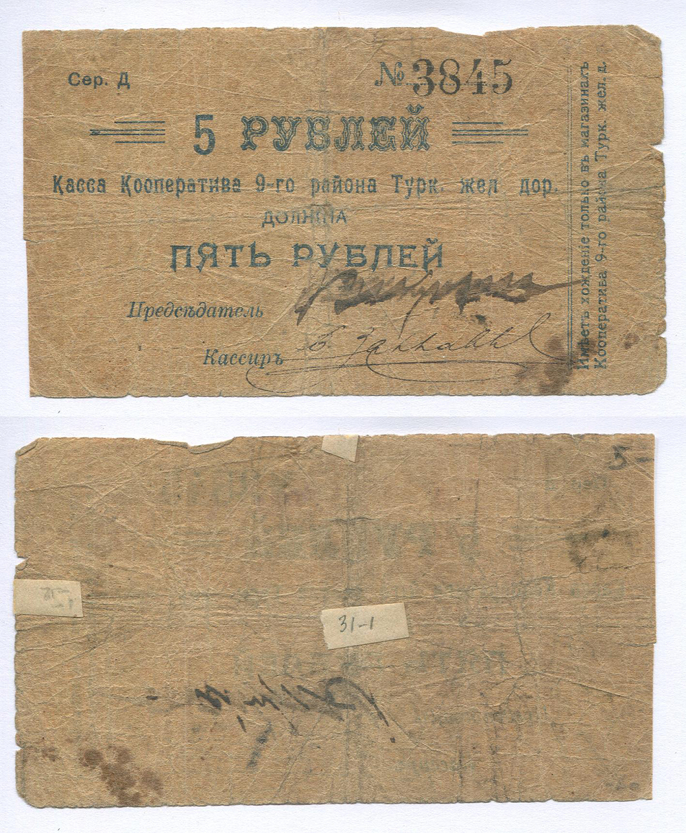 Коканд. Касса Кооп. 9-го р-на Туркестанской ж/д. 5 руб. Рябч.2 № 20292 # Д 3845