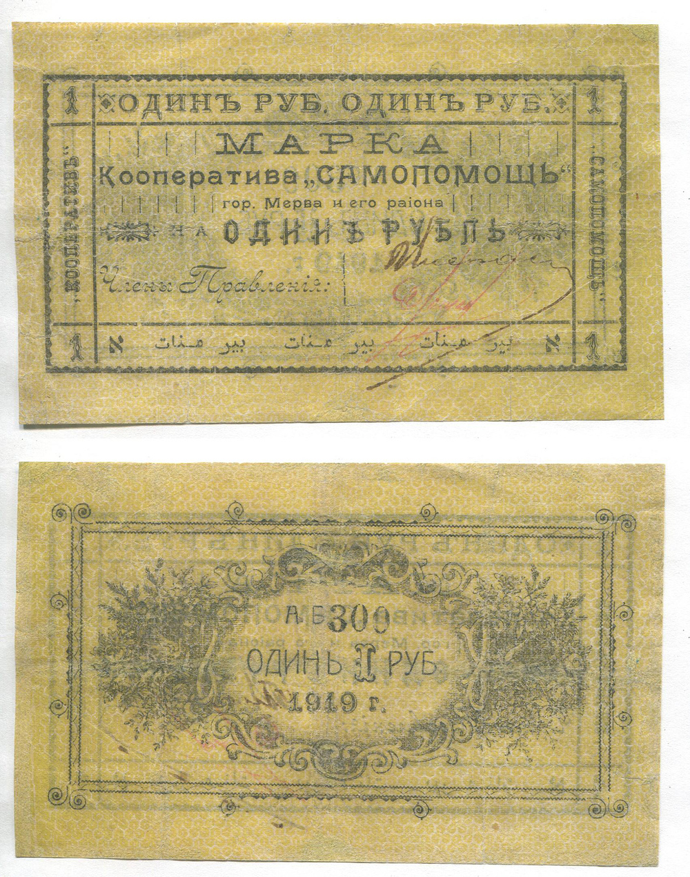 Мерв (Мары). Кооператив "Самопомощь". Марка. 1 руб. Рябч.2 № 22790 # 300