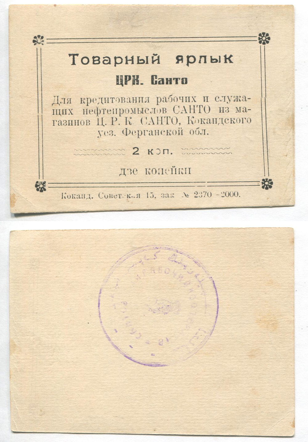 Санто (Ферганской обл.). Ц. Р. К. нефтепромыслов "Санто". Товарный ярлык. 2 коп. Рябч.2 № 20349