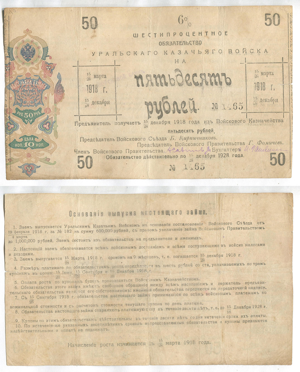 Уральское Казачье Войско. 6% Обязательство Войскового Казначейства. 50 руб. Рябч.2 № 7320a # 1465