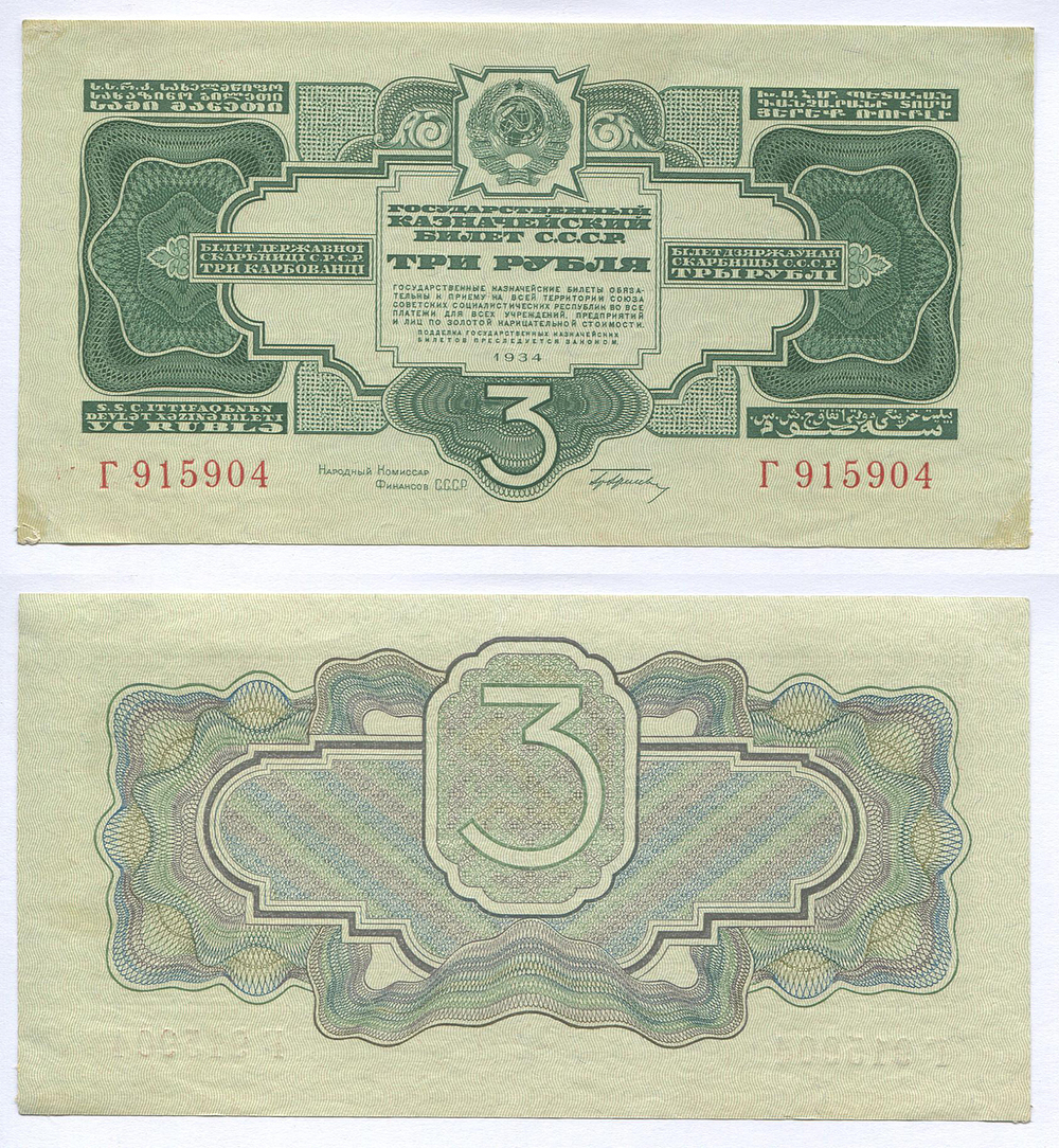 СССР. Государственный Казначейский Билет. 3 руб. 1934 г. Г 915904