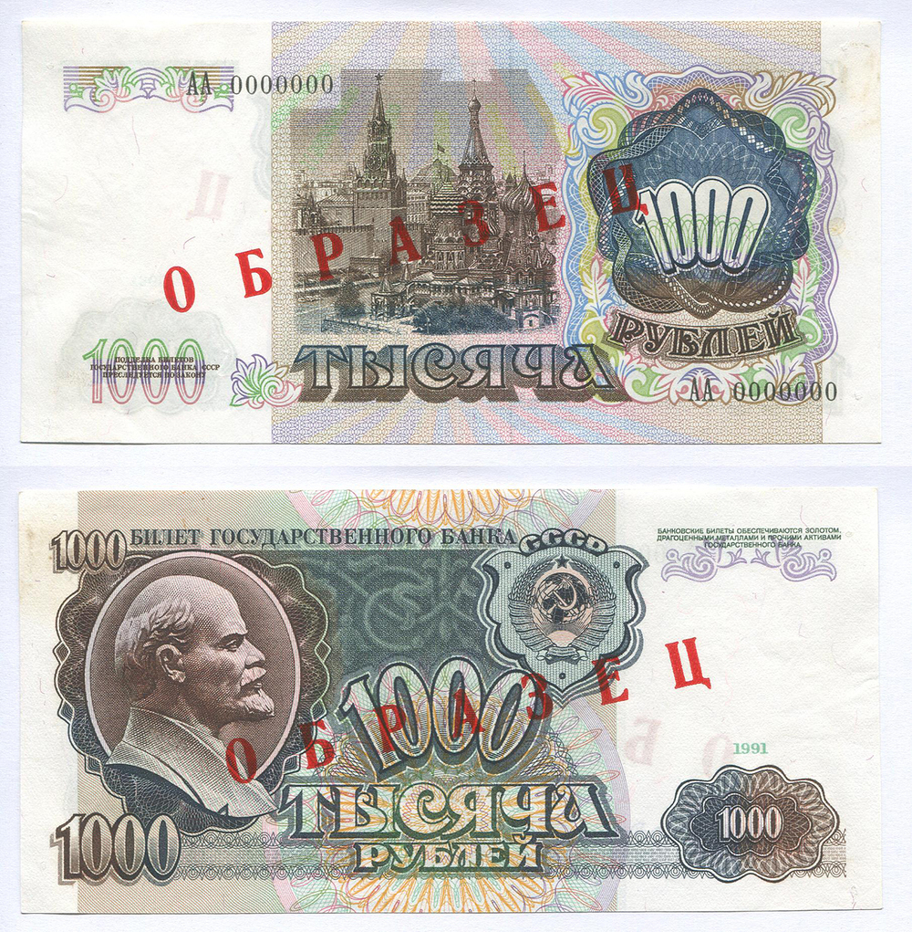 РФ. 1000 руб. Банк России. 1991 г. АА 0000000 Образец
