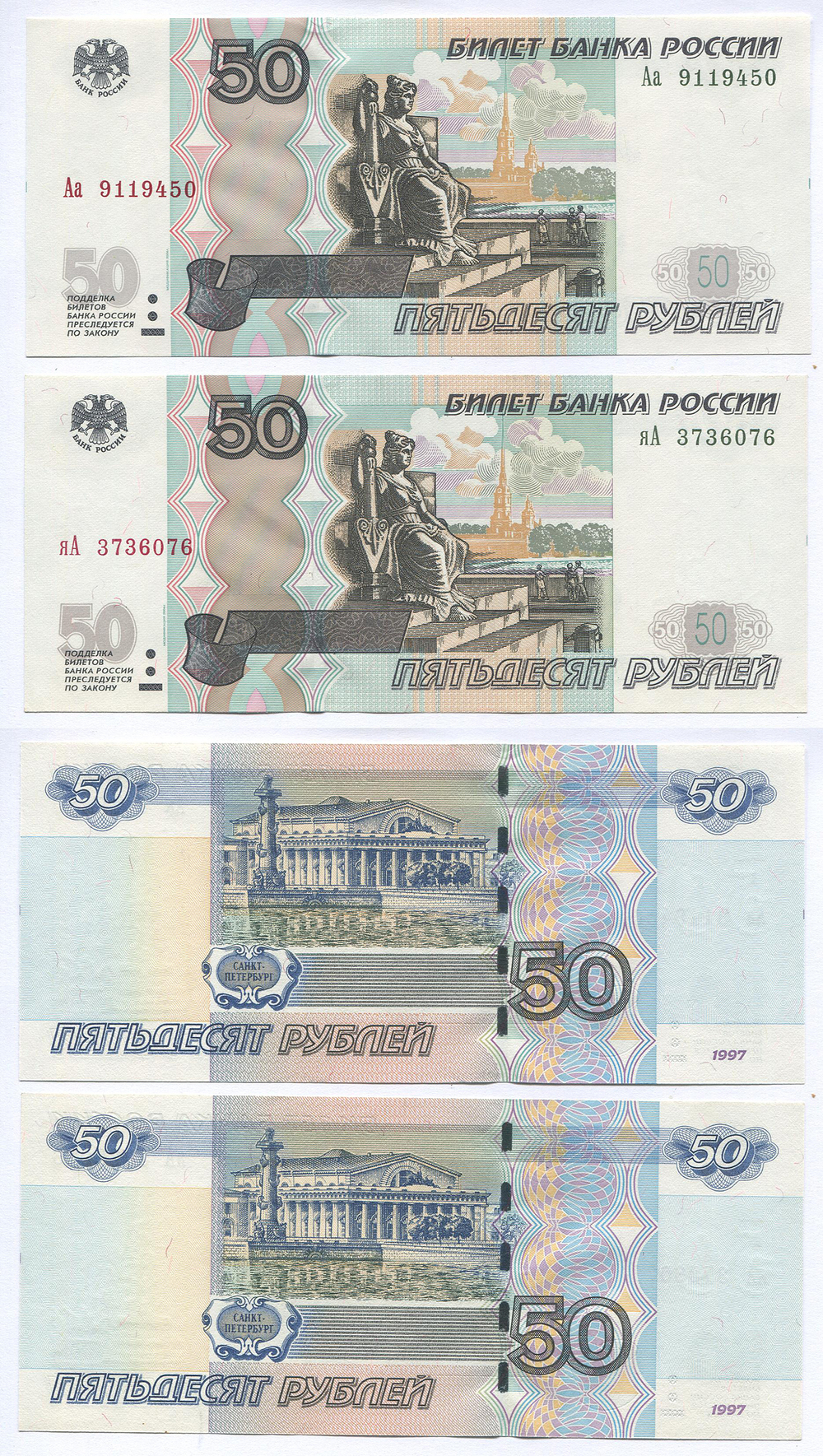 РФ. 50 руб. Банк России. 2004 г. Аа 9119450 и яА 3736076 2 шт.
