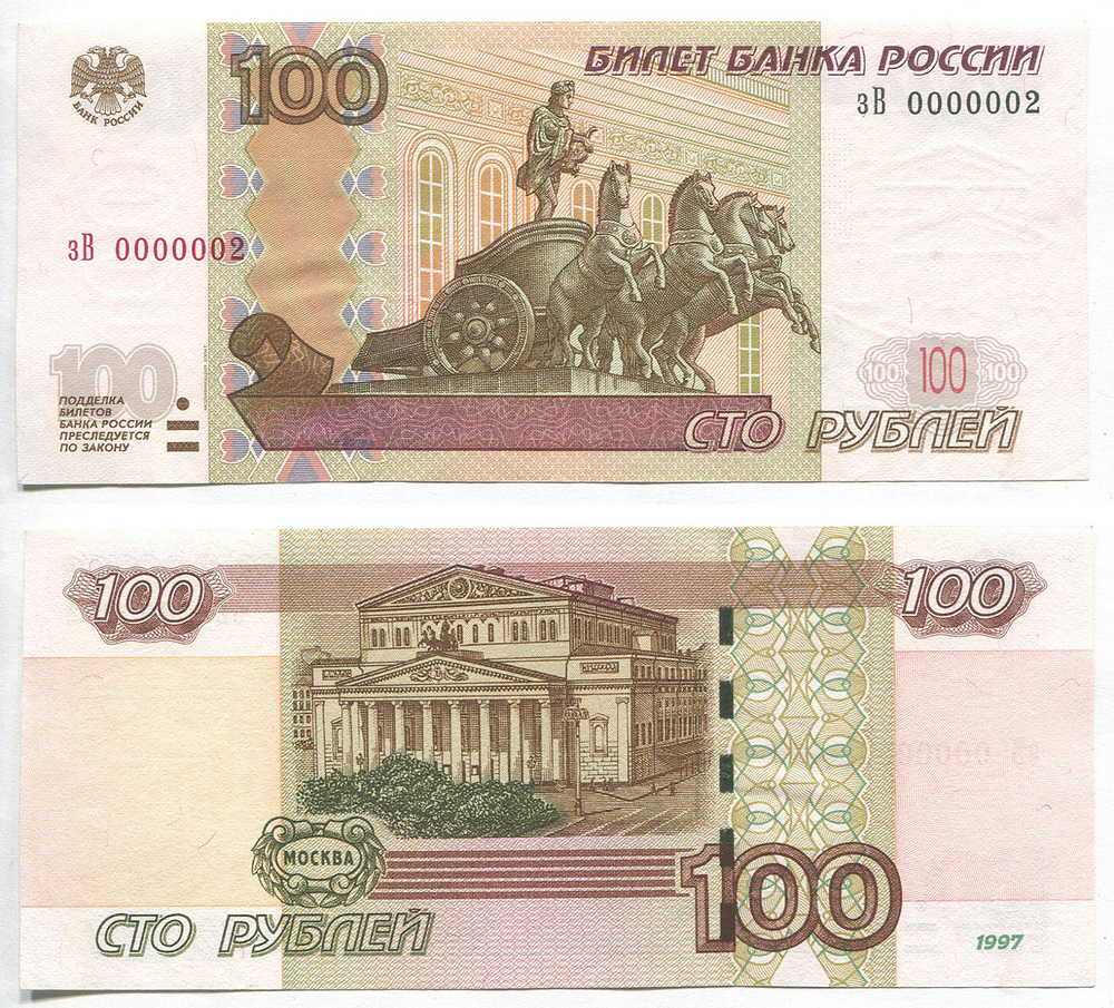 РФ. 100 руб. Банк России. 2004 г. АЧ 0000002
