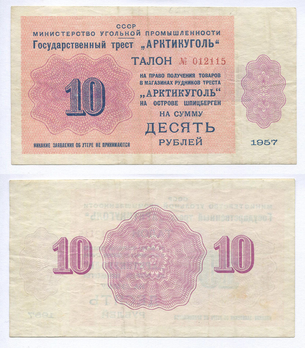 Государственный трест «Арктикуголь». Талон. 10 руб. 1957 г. № 012115