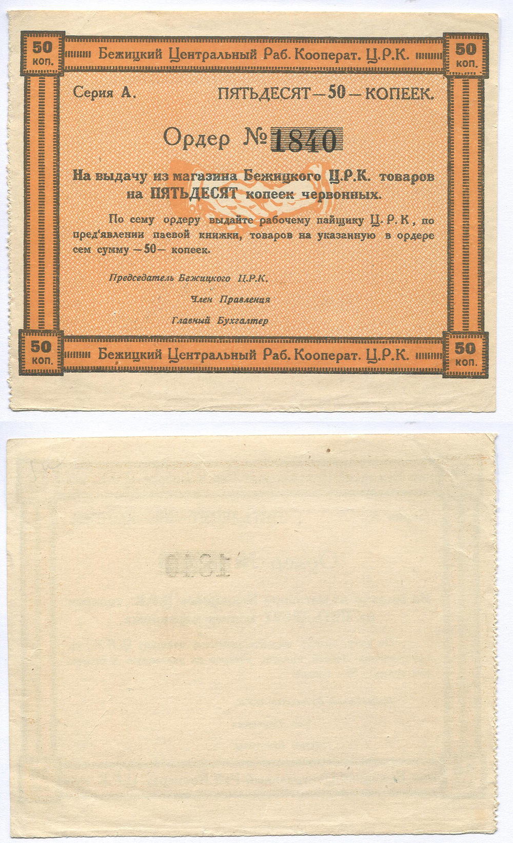 Бежица (Брянской губ.). ЦРК. Ордер. 50 коп. # 1840