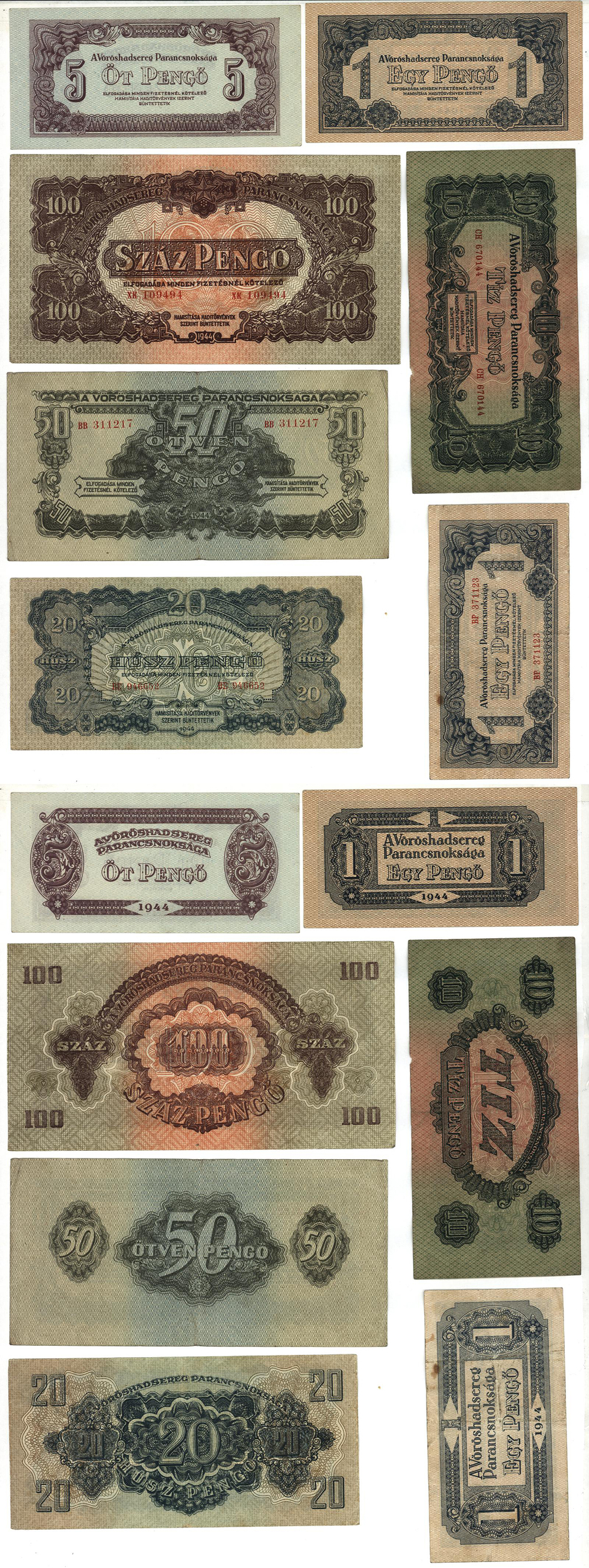Групповой лот. Венгрия. Военные деньги СССР. 1, 1, 5, 10, 20, 50 и 100 пенго. 7 шт.
