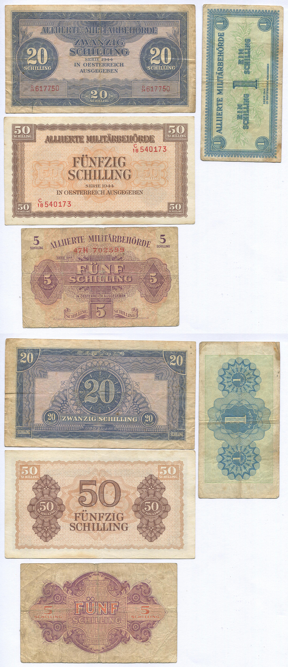 Групповой лот. Австрия. Военные деньги. 1, 5, 20 и 50 шиллингов. Pick № 103-109. 4 шт.