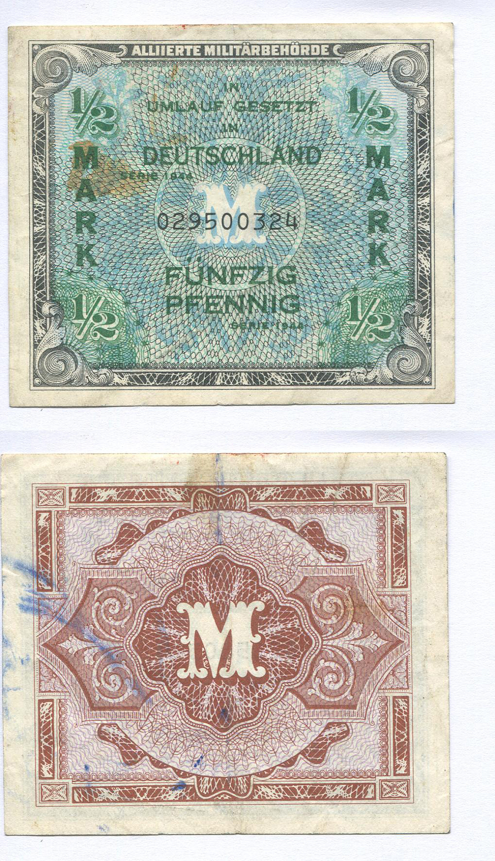 Германия. Оккупационная зона. 1/2 марки. Pick № 191a # 029500324 есть F в виньетке