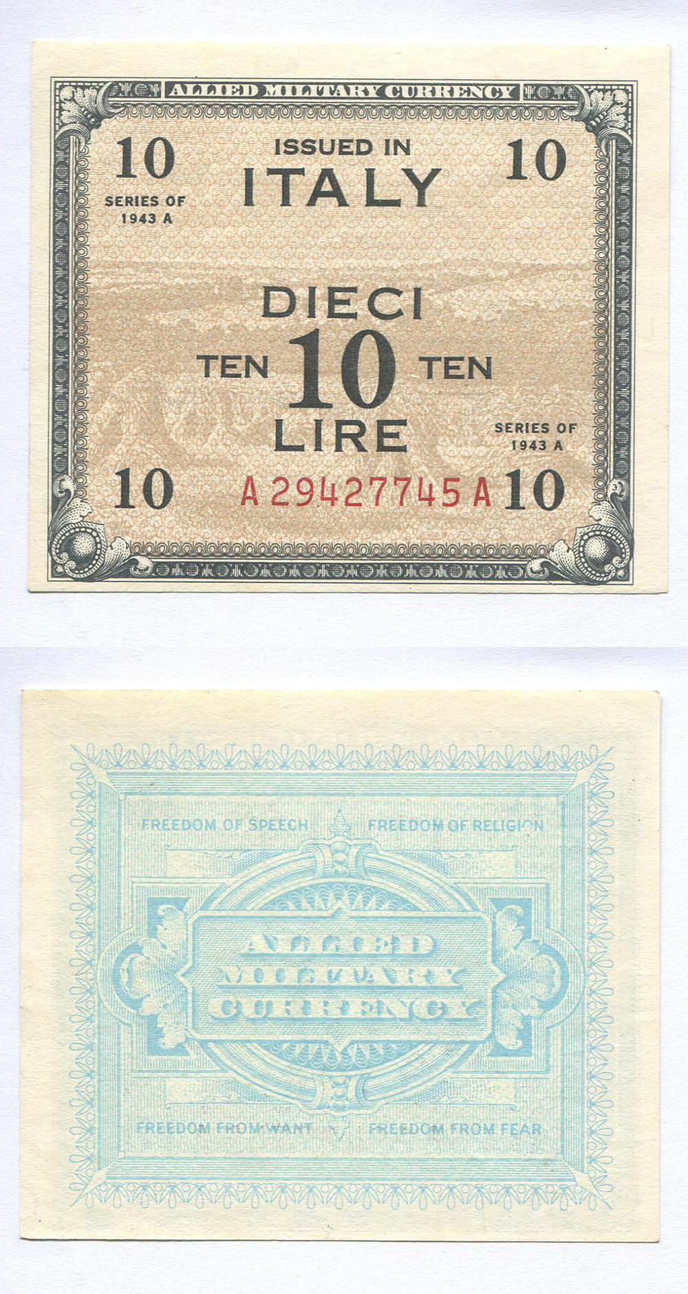 Италия. Военные деньги. 10 лир. 1943 г. Pick № М19a # A 29427745 A есть F в виньетке
