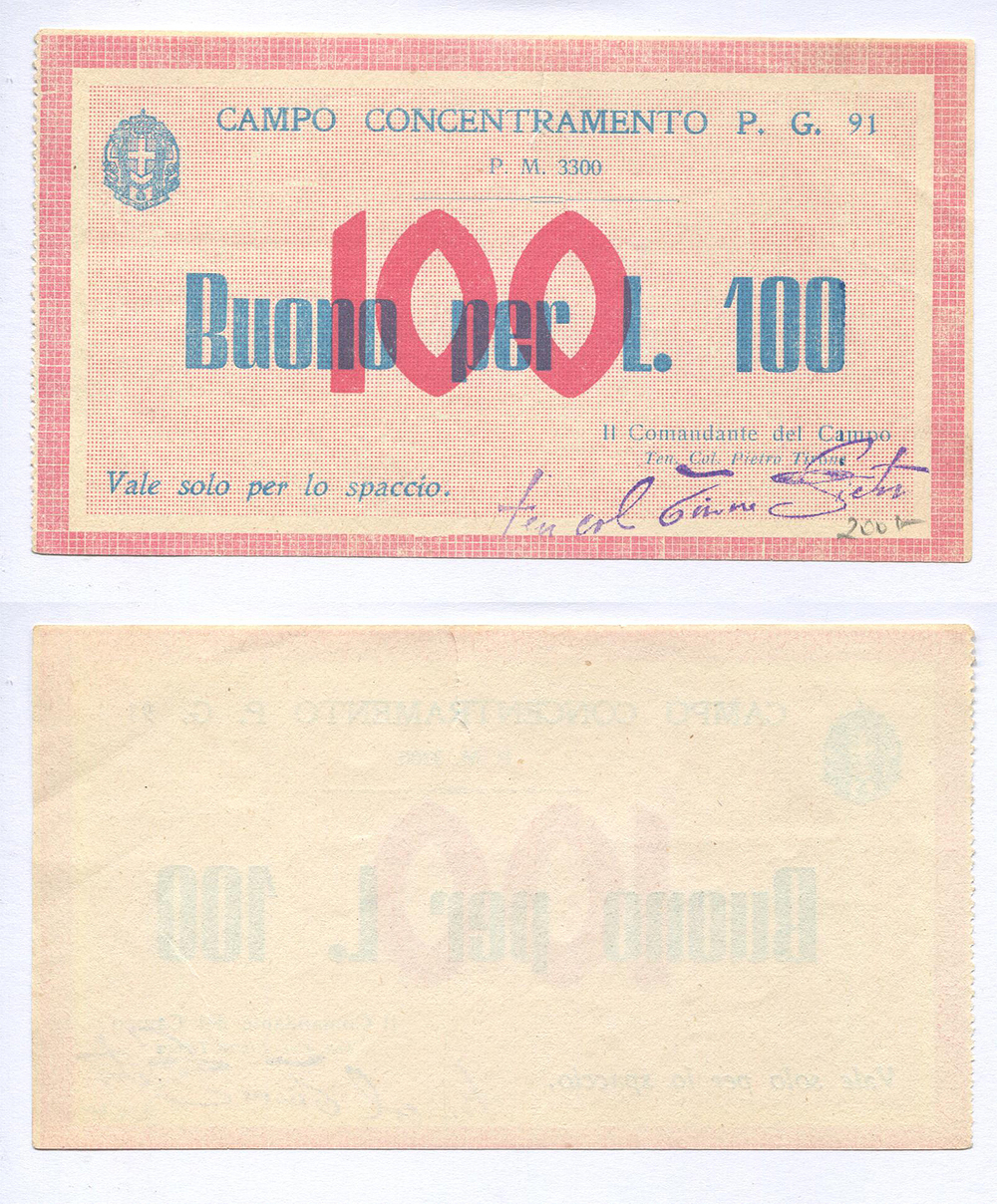 Италия. Концлагерь для военнопленных № 91. Бон. 100 лир. 1939-1945 гг. P.M. 3300 с в/зн