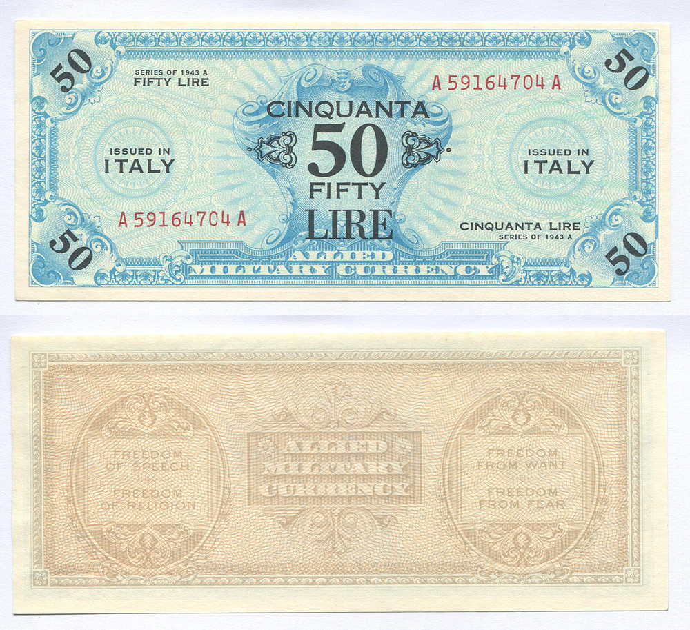 Италия. Военные деньги. 50 лир. 1943 г. Pick № М20a # A 59164704 A есть F в виньетке
