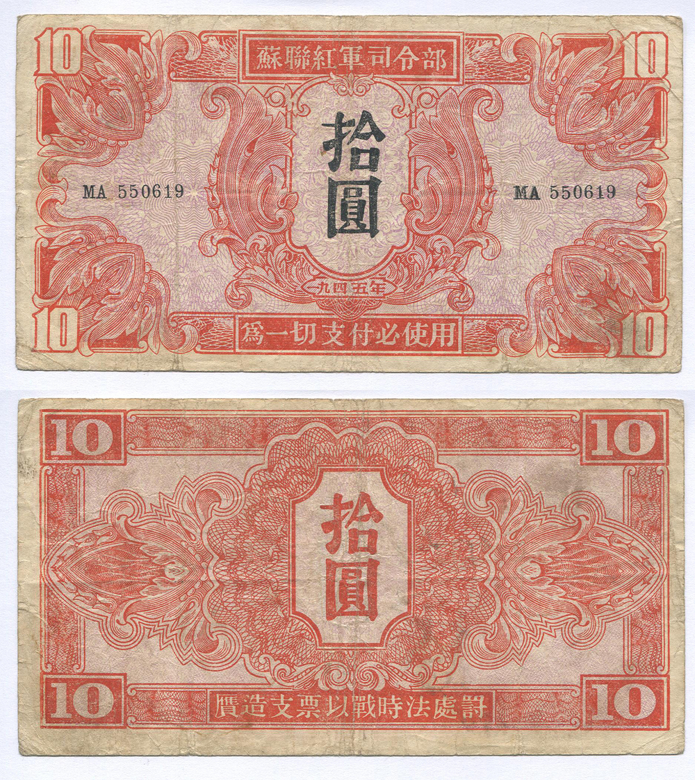 Манчжурия. Выпуск Советских войск. 10 юаней. Рябч.2 № 27961 # МА 550619 без марки