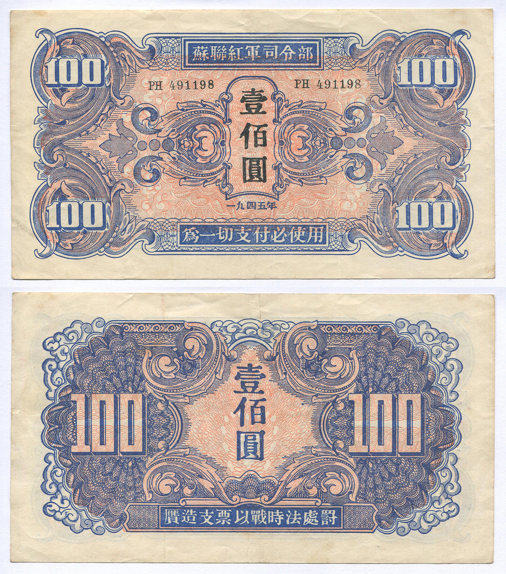 Манчжурия. Выпуск Советских войск. 100 юаней. Рябч.2 № 27962 # РН 491198 без марки