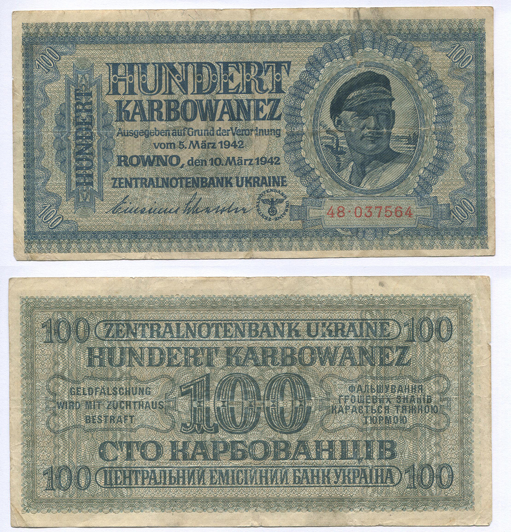 Ровно. Германская оккупация. Денежный знак. 100 карб. Рябч.2 № 13240 # 48*037564