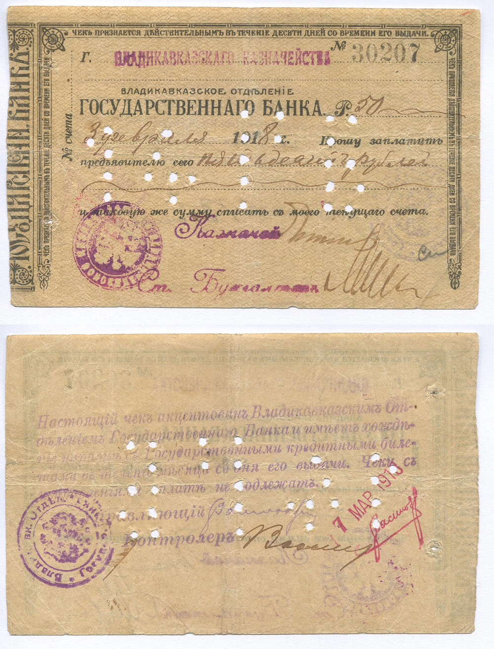 Владикавказ. Отделение Гос. Банка. Чек. 50 руб. Казначейство # 30207 рукописный номинал