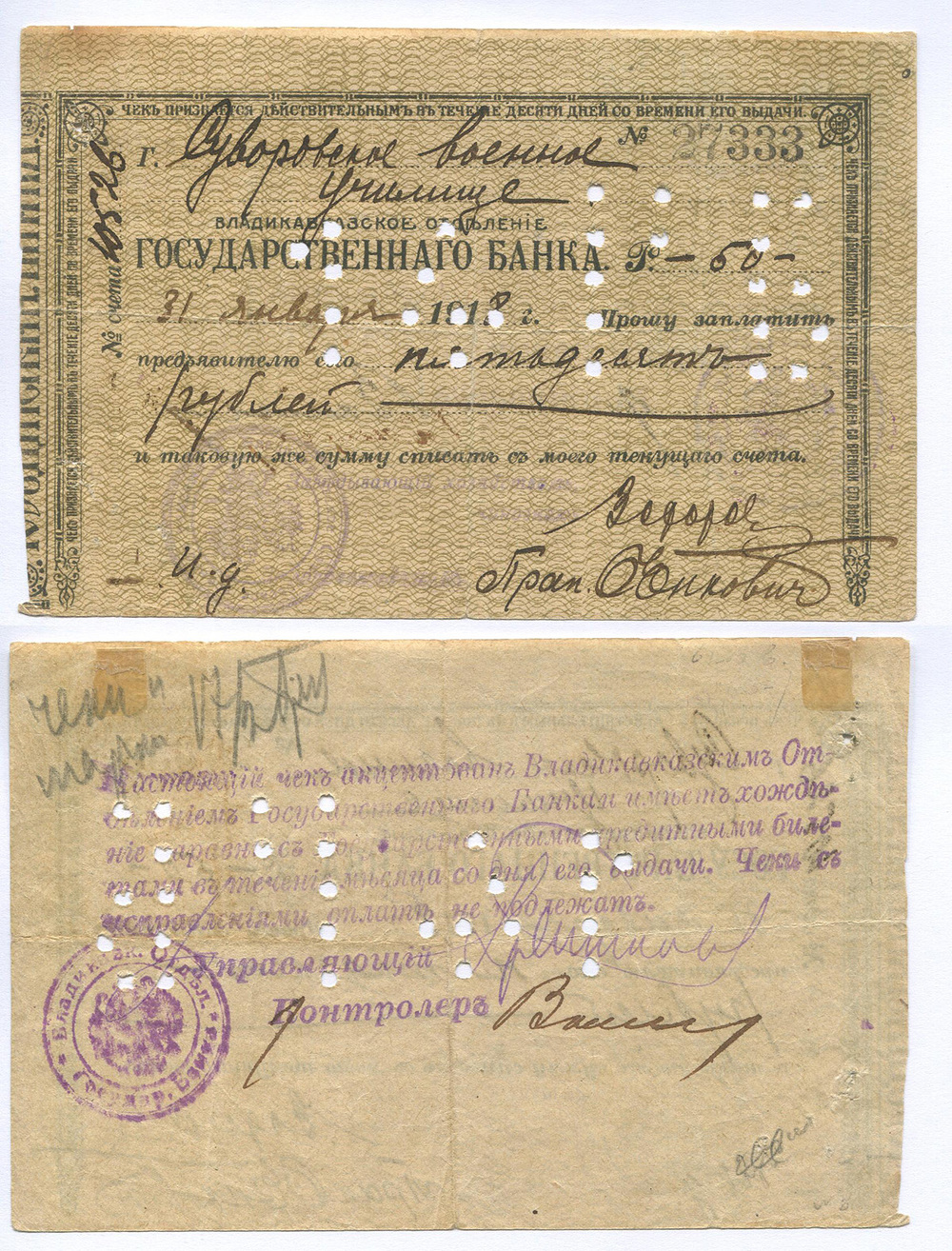 Владикавказ. Отделение Гос. Банка. Чек. 50 руб. Суворовское военное учили # 27333 рукописный н