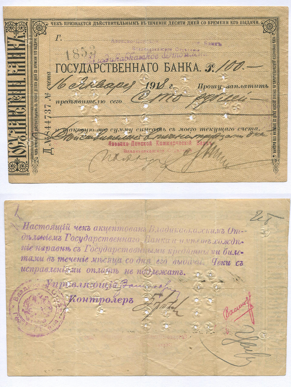 Владикавказ. Отделение Гос. Банка. 100 руб. Д №844737