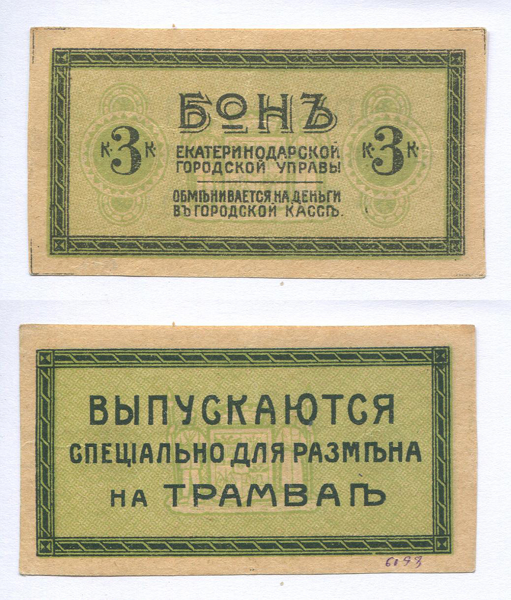 Екатеринодарская Городская Управа. Для размена на трамвае. 3 коп. зеленый фон