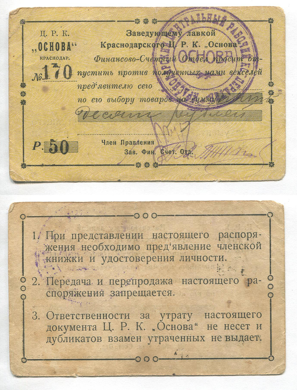 Краснодар. ЦРК "Основа". Зав. лавкой. Распоряжение. 50 руб. # 170