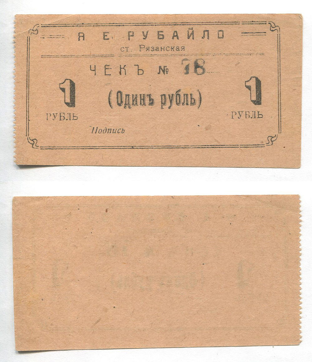 Рязанская (Кубанской обл.). Я.Е. Рубайло. 1 руб. Чек. # 78
