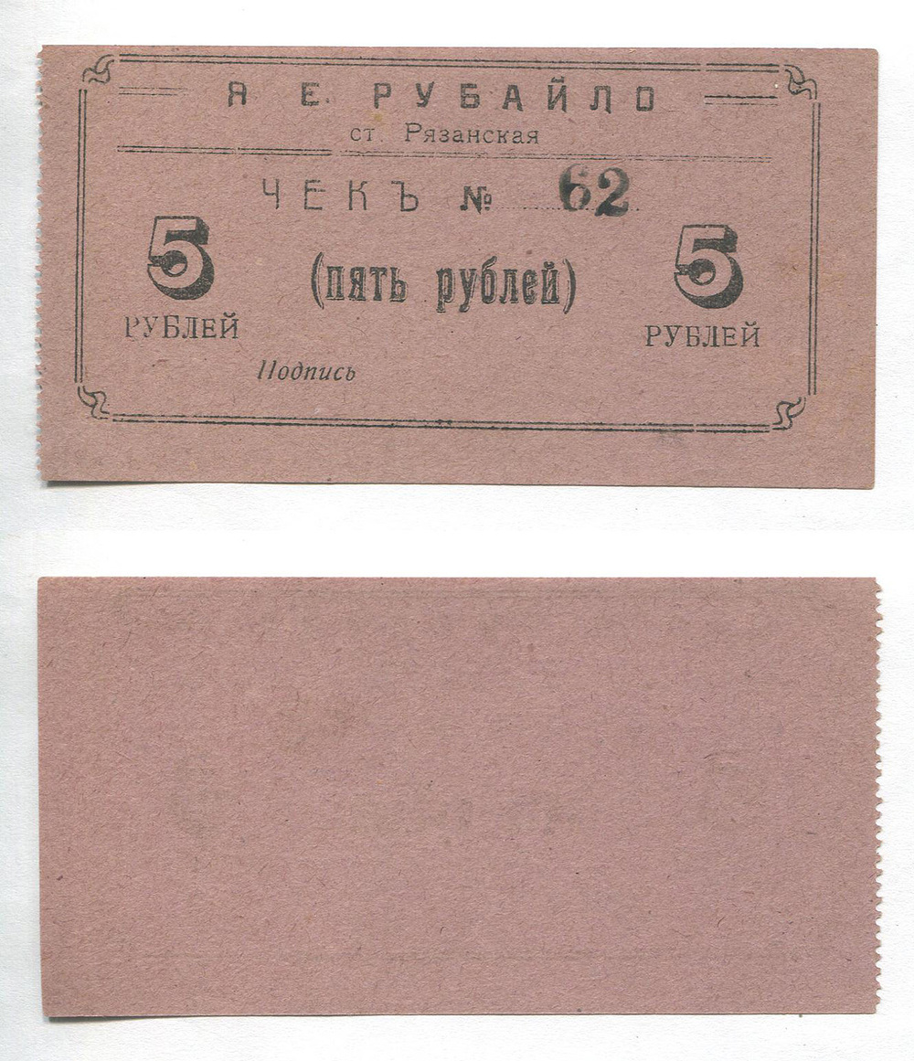 Рязанская (Кубанской обл.). Я.Е. Рубайло. 5 руб. Чек. # 62