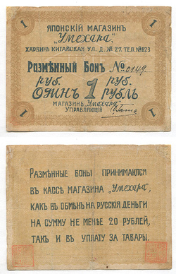 Харбин. Японский магазин Умехара. Разменная бона. 1 руб. Рябч.2 № 26169 # 0149