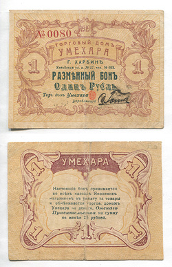 Харбин. Торговый Дом Умехара. Разменная бона. 1 руб. Рябч.2 № 26165 # 0080
