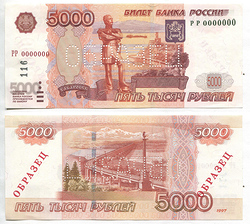 РФ. 5000 руб. Банк России. 1997 г. РР 0000000 Образец