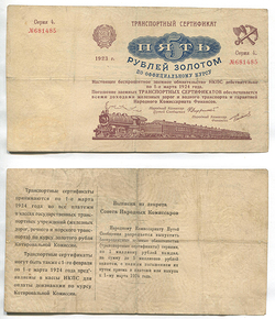 РСФСР. Транспортный сертификат. 5 руб. золотом Серия 4 № 681485