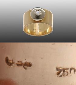 Западная Европа. Золото 750 пр. 1 бриллиант весом: ~ 0.138 ct. Вес: 12.80 гр. Размер: 16,5.