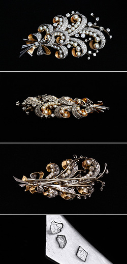 Платина 950 пр. Золото 750 пр. Вес: 34.09 гр. Вставки: 159 бриллиантов расчетным весом: ~ 8.67 ct., а именно: 2 бриллианта Ст58 весом: ~ 0.73 ct. 5-6/8; 15 бриллиантов Ст58 весом: ~ 2.41 ct. 4/5; 12 бриллиантов Ст58 весом: ~ 1.05 ct. 4/5-6; 115 бриллиантов Ст18 и Ст34 весом: ~ 3.68 ct. 2/3-4; 15 бриллиантов Бп25 и Бт25 весом: ~ 0.80 ct 3/5; жемчуг. Справка: клеймо Франции "голова собаки" для платины 950 пр. Клеймо Франции "голова орла" для золота 750 пр. Вес, цвет и чистота бриллиантов определены в оправе.